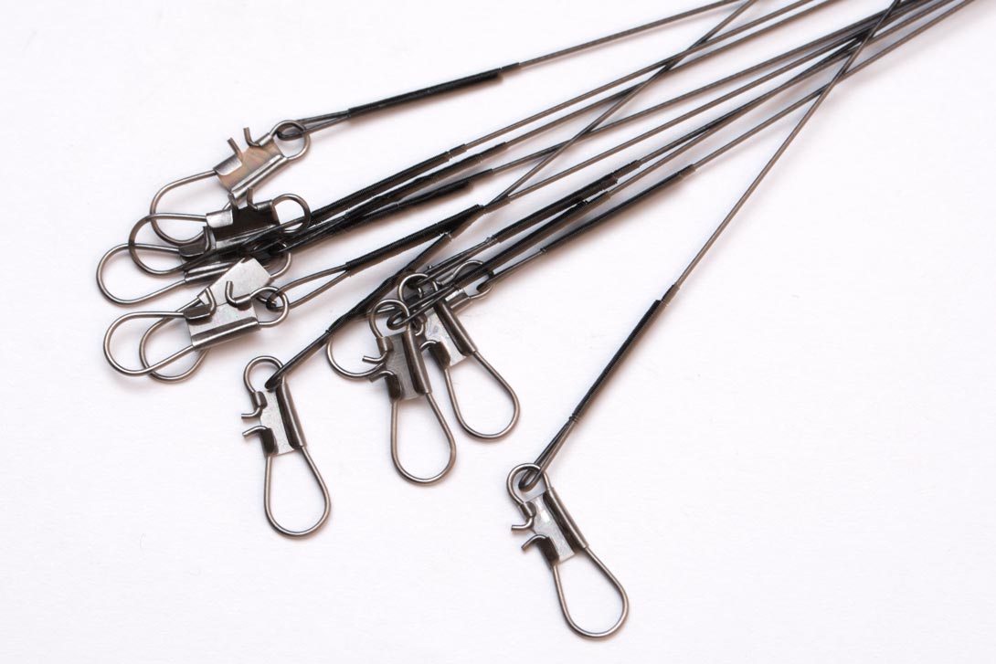 wire with a 20lb breaking strain, a size 8 60lb rolling swivel at one end, with a quick release link