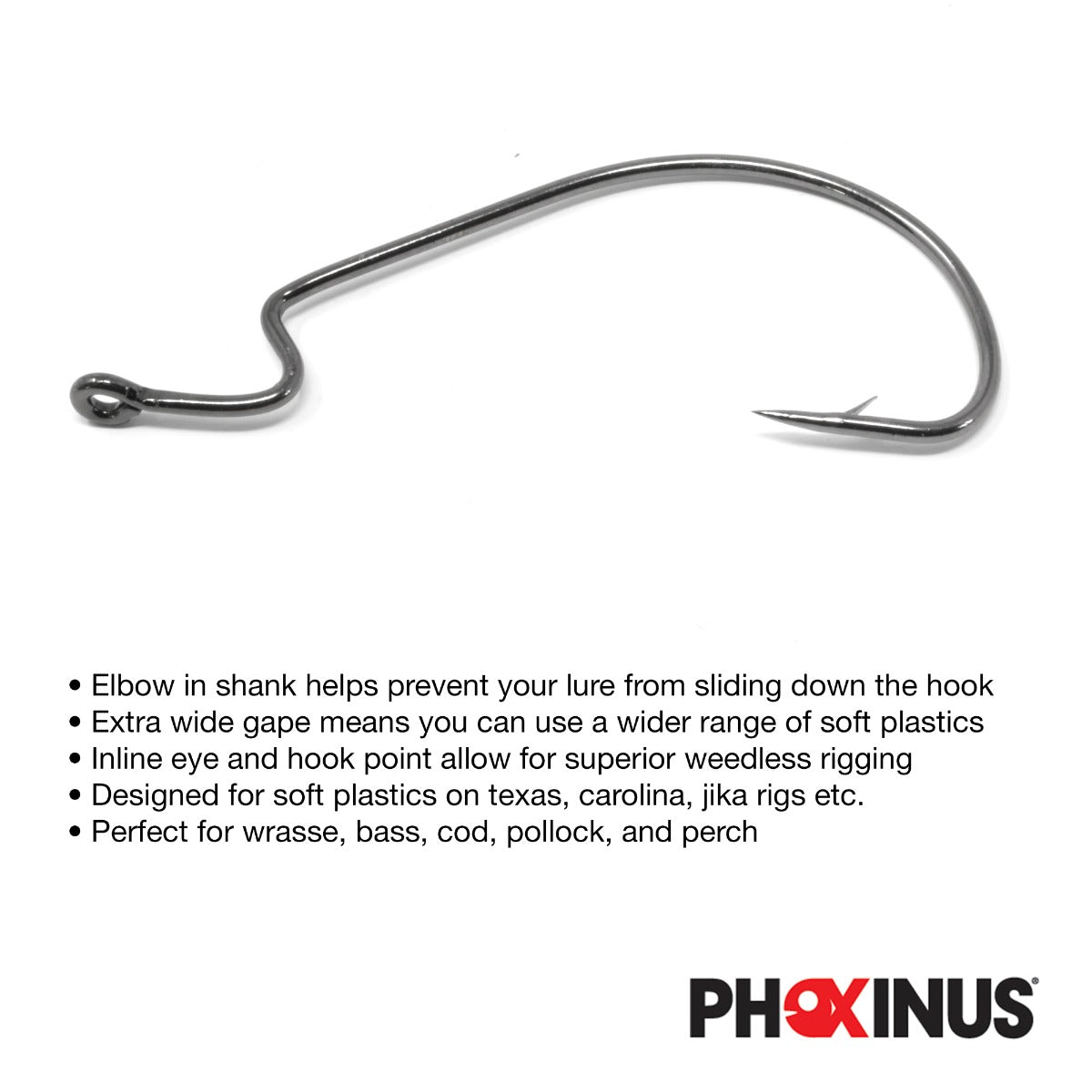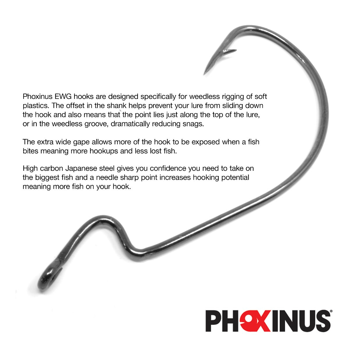 - EXTRA WIDE GAP FOR BULKY LURES -When compared to traditional offset hooks, the wide gape of Phoxinus EWG hooks gives bulkier soft plastics more room to move and expose the hook point, giving you confidence that you'll hook more fish more often.